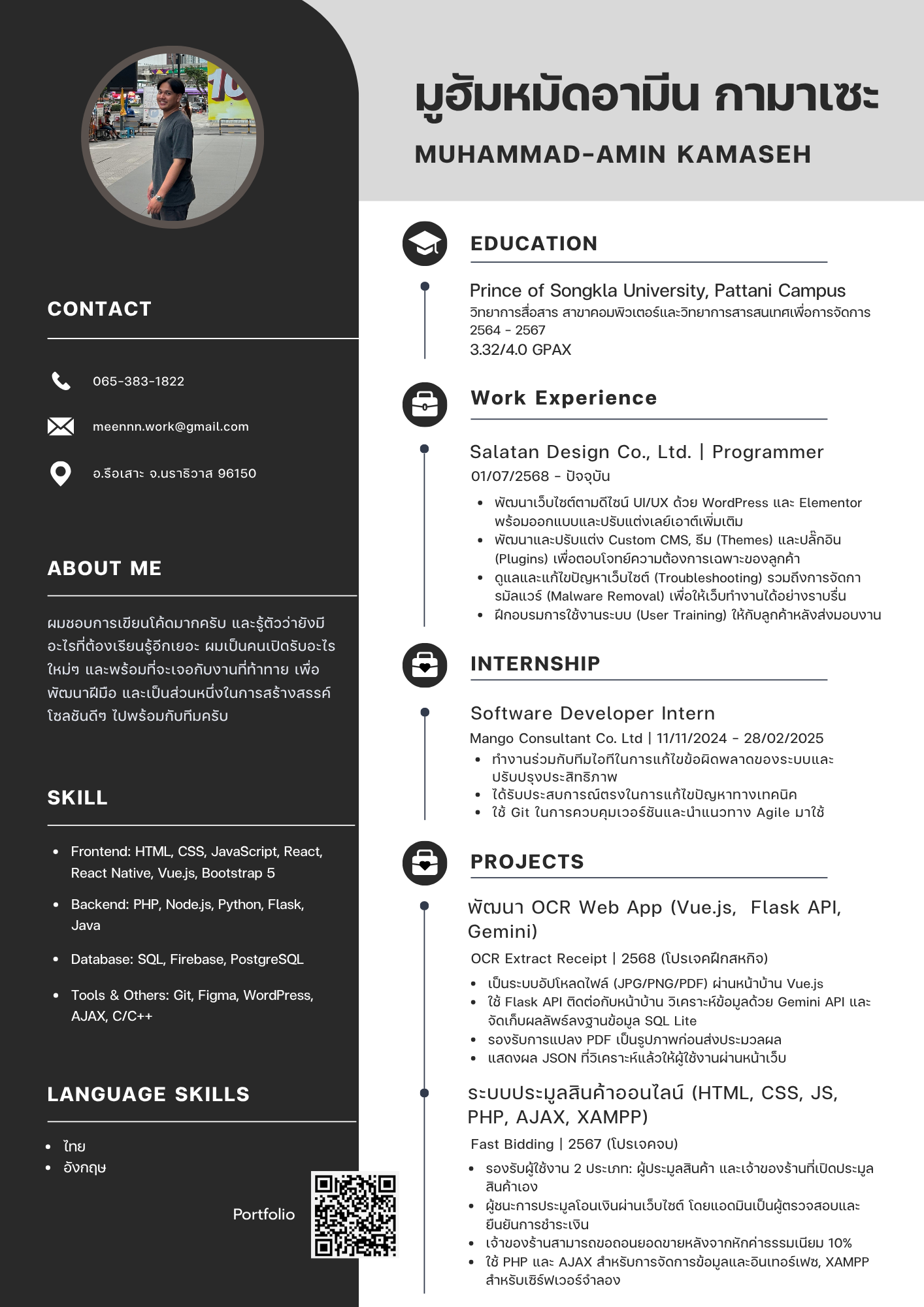 - I graduated from Prince of Songkla University, Pattani Campus, with a degree in Computer Science and Information Science for Management, achieving a 3.32/4.0 GPA. During my studies, I actively participated in the IT Club, where I took on leadership roles, organized events, and developed projects. Additionally, I was a key member of the Pattani Esports Club, gaining experience in project management, event planning, and team collaboration.